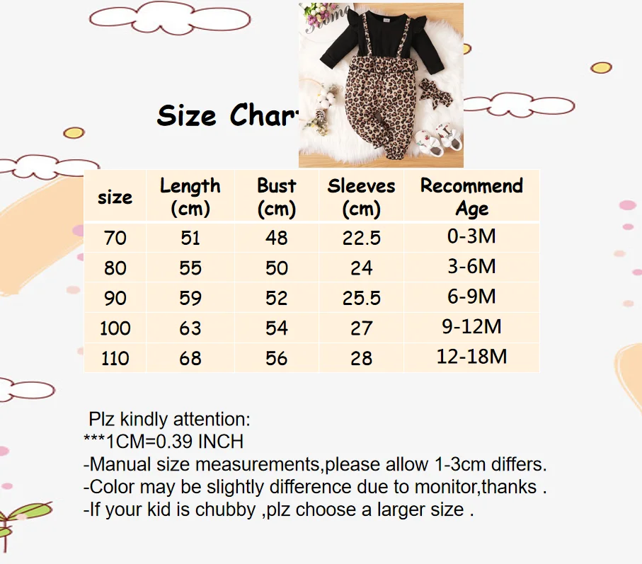 Macacão para bebês recém-nascidos de 0 a 18 meses, manga longa, com babados, estampa de leopardo, faixa de cabeça