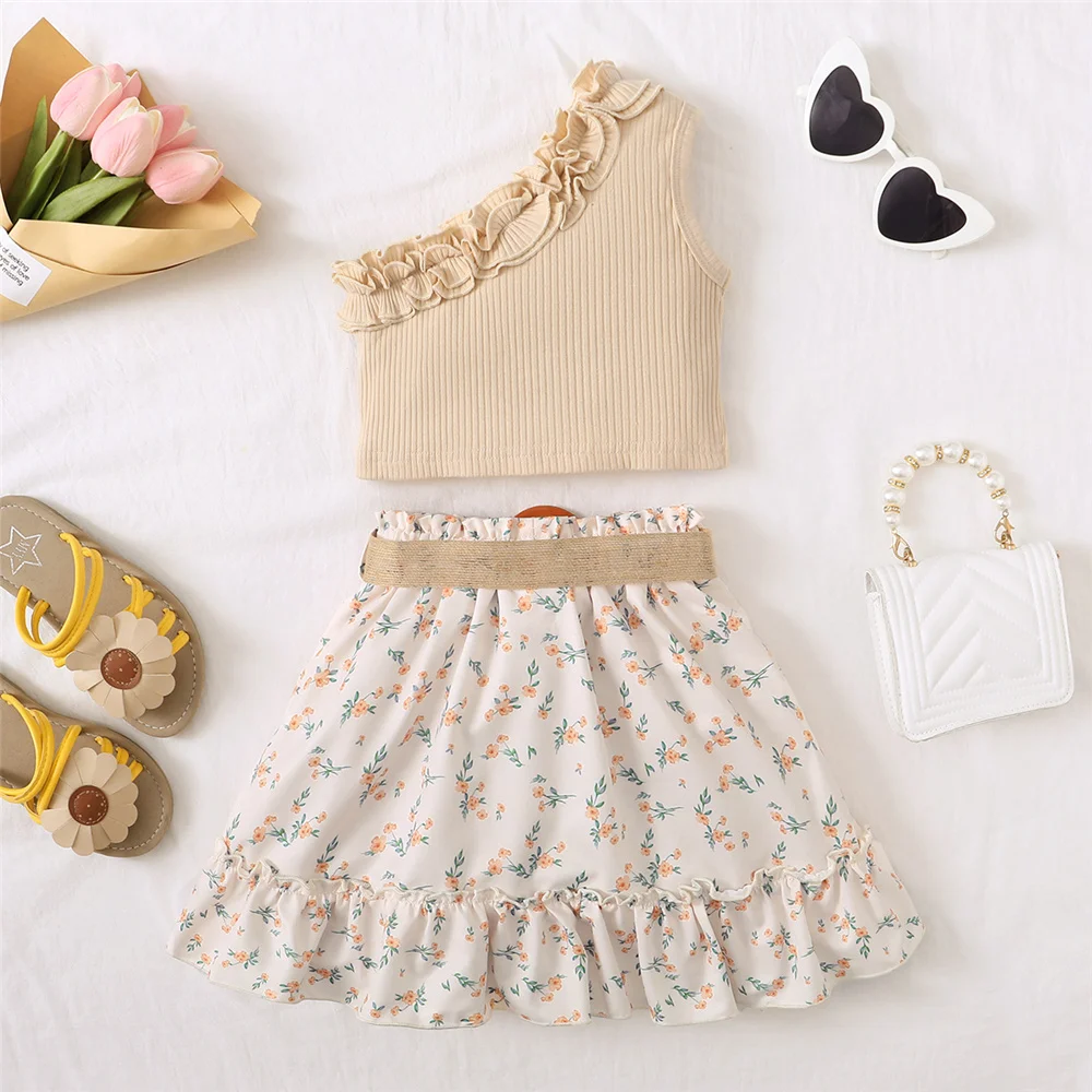 Conjunto de roupas infantis para meninas 2 peças, blusa retrô com ombros de fora + saia floral, roupas de verão com senso de design para meninas de 1 a 6 anos